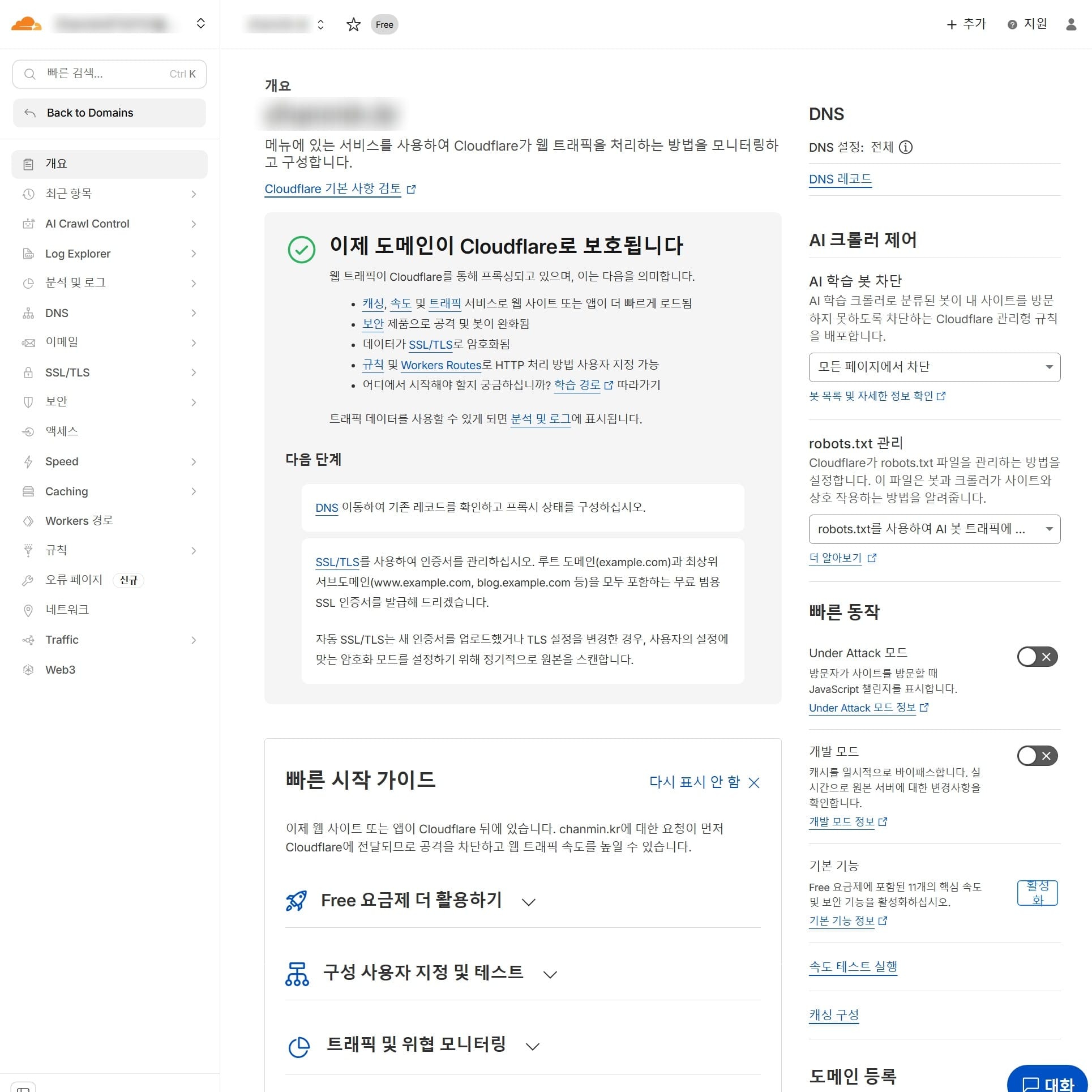 이렇게 Cloudflare에 도메인 등록까지 완료하였다.