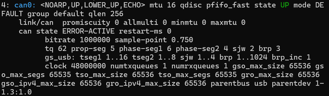 can0: <NOARP,UP,LOWER_UP,ECHO> mtu 16 qdisc pfifo_fast state UP mode DEFAULT group default qlen 10