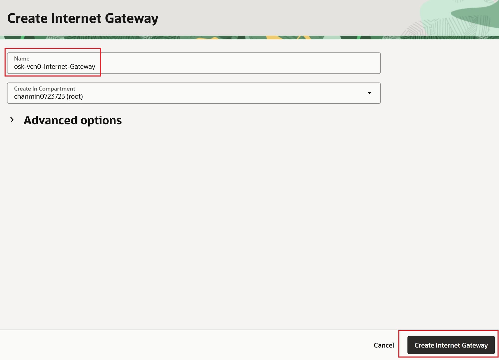 다시 VCN에서 Gateways 메뉴로 이동 후 Create Internet Gateway 클릭