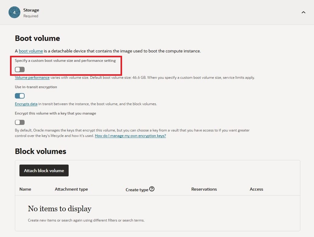 Specify a custom boot volume~ 옵션을 통해 원한다면 용량을 조절할 수 있습니다.